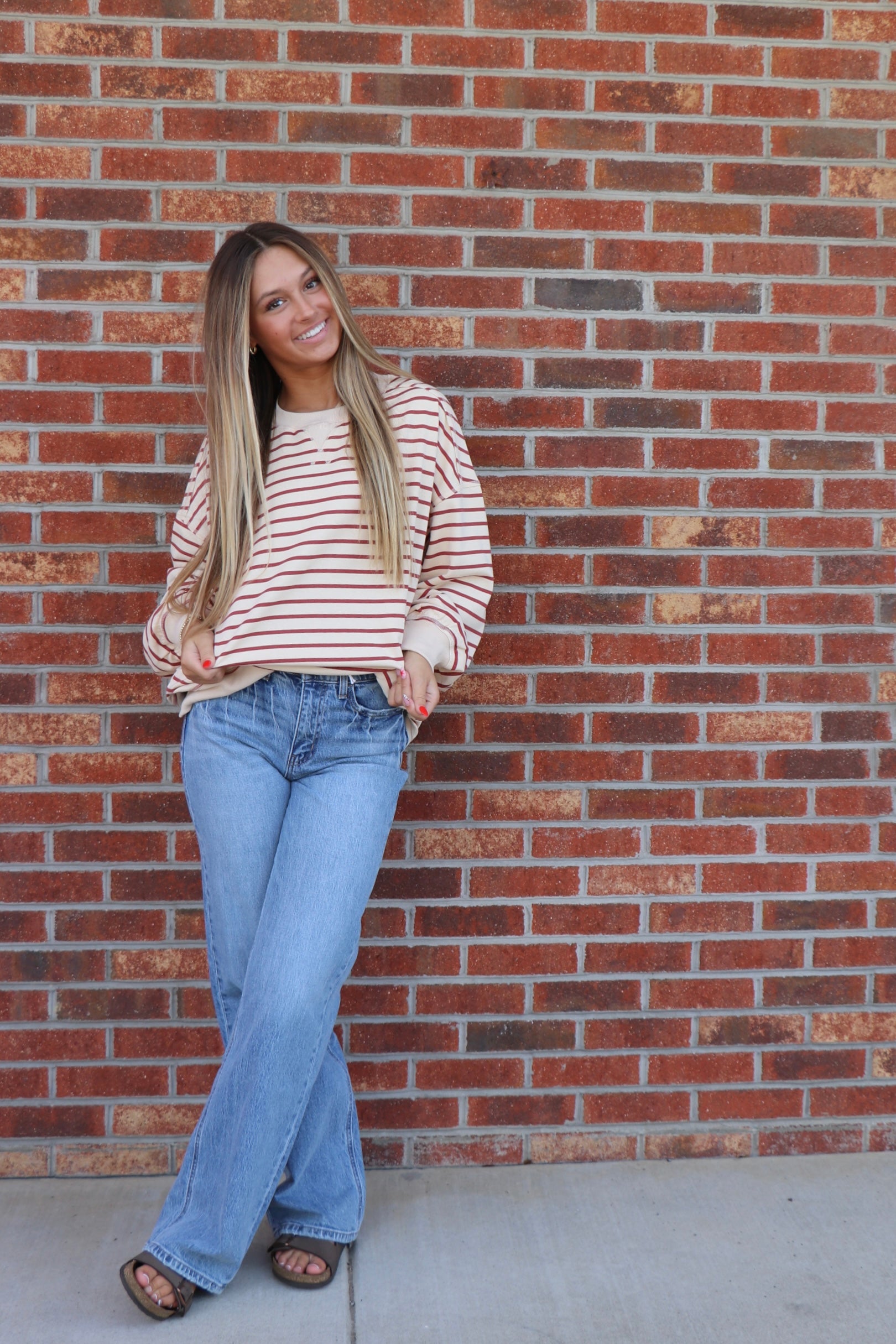 Embrace cozy vibes with the Comfy Stripes Top, your new go-to for easy, breezy style. This oversized knit features playful stripe details and a relaxed drop shoulder for a laid-back look. Perfect for early autumn days, its long sleeves and soft fabric keep you snug while effortlessly elevating your casual outfit. Step into comfort with a touch of fun!