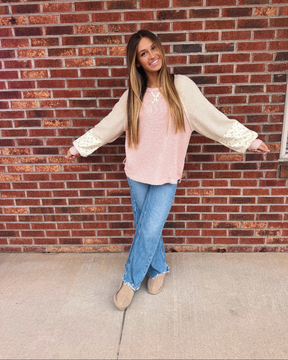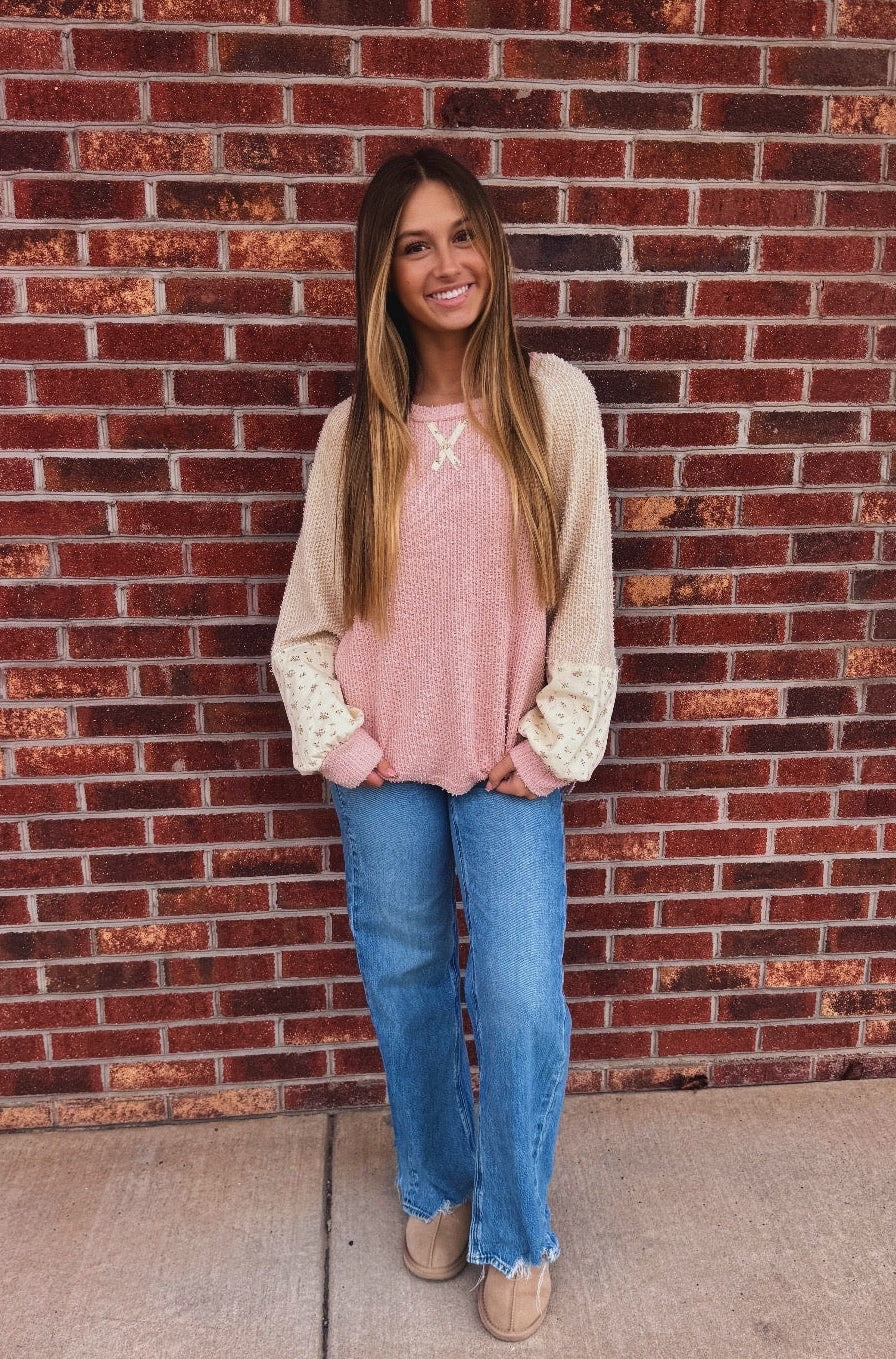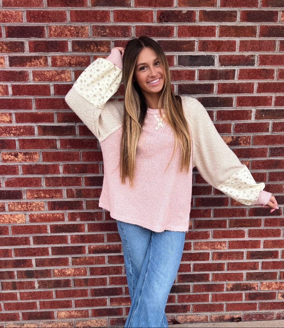 The Follow Through Top effortlessly blends casual comfort with refined style. This textured knit features striking color-block raglan sleeves and an elegant floral print that adds visual interest. The relaxed round neckline and raw edge detailing create an intentionally undone aesthetic, while subtle side slits provide movement and dimension. Perfect for layering or wearing solo, this piece transitions seamlessly from weekend errands to casual gatherings with understated sophistication.