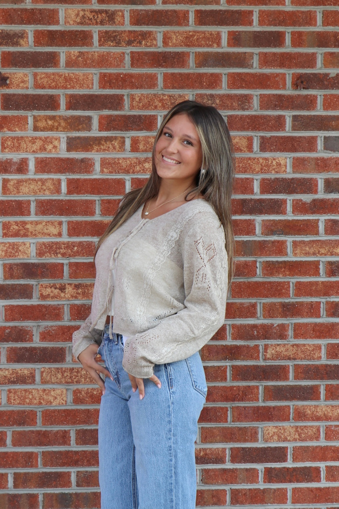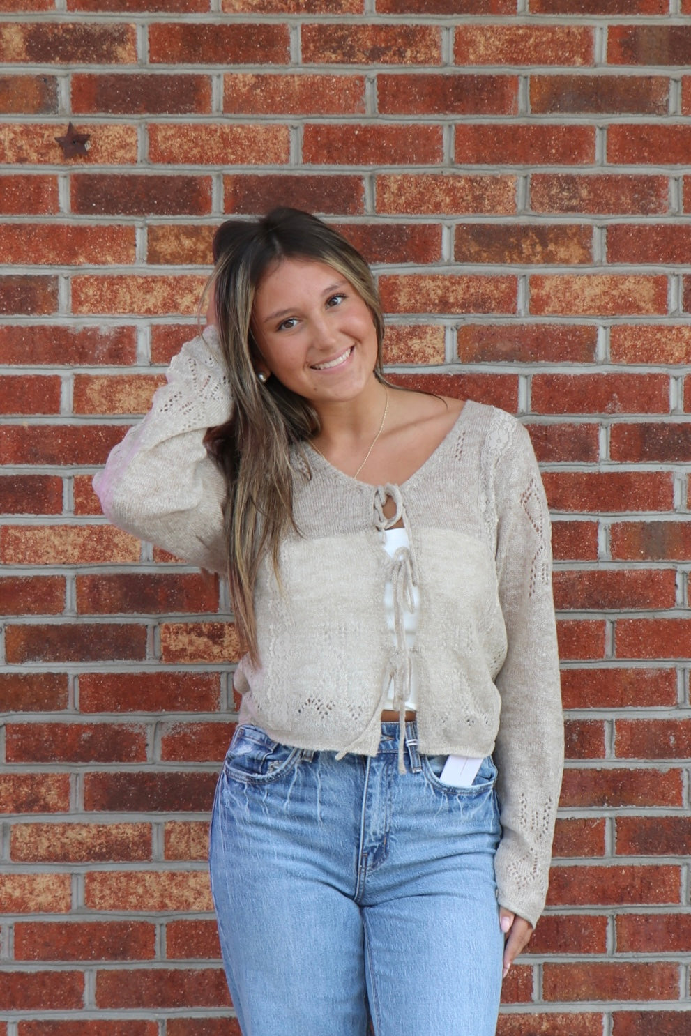 Elevate your layering game with the Meet Me Sweater, featuring a delicate lace-contrasted tie front that adds a touch of femininity to classic knitwear. This cardigan effortlessly combines comfort and style, making it perfect for both casual days and chic evenings. The soft knit fabric ensures cozy warmth, while the unique tie-front design creates a flattering silhouette that enhances any outfit. Make a statement with subtle elegance and versatile charm in this wardrobe essential.