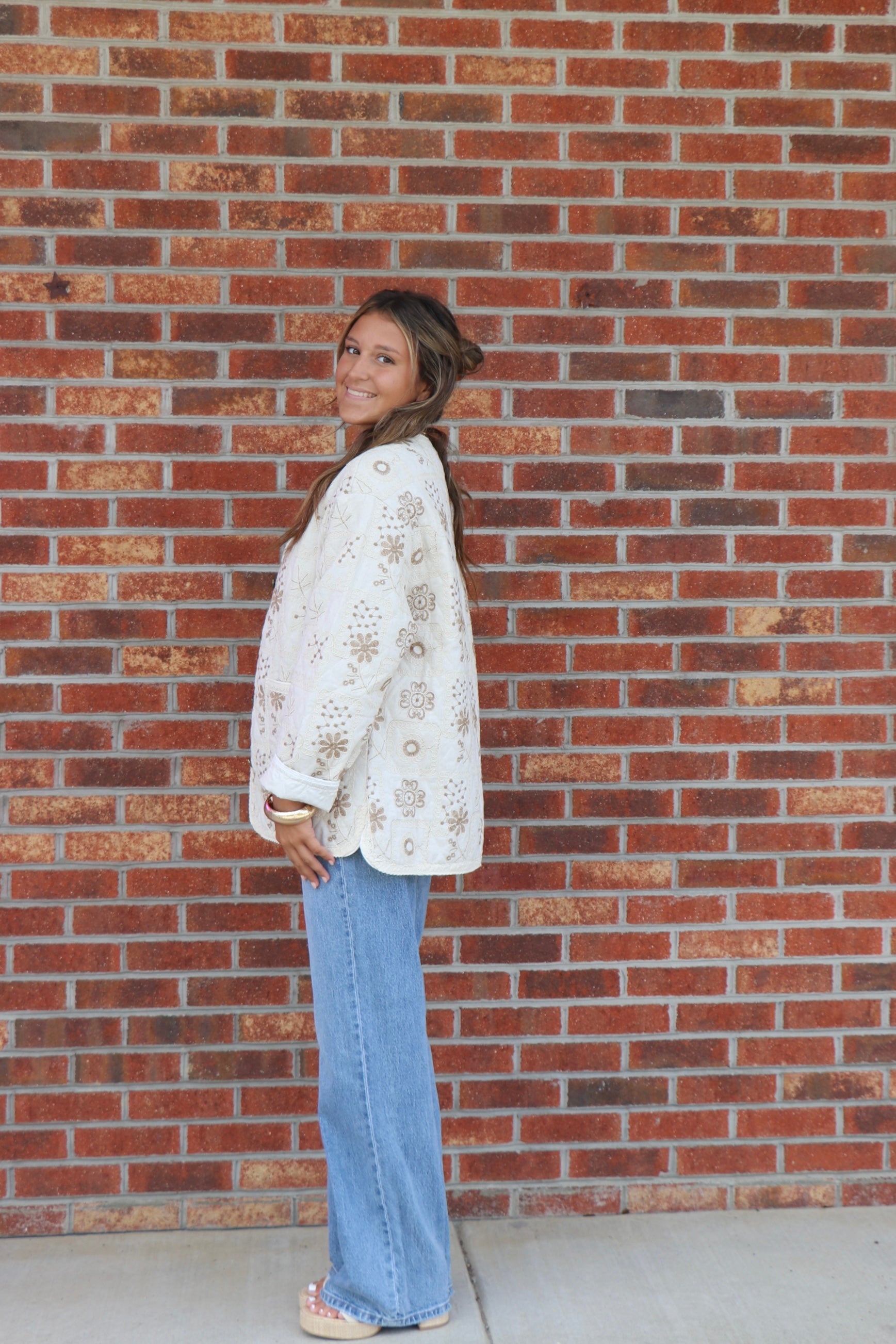 Slip into a storybook adventure with the Once Upon a Time Jacket. This cozy, roomy-fit quilted woven jacket features playful floral embroidery and a charming contrast border piping that adds a little magic to every wear. The V-neck and long sleeves keep it effortlessly stylish and perfect for layering on whimsical days.