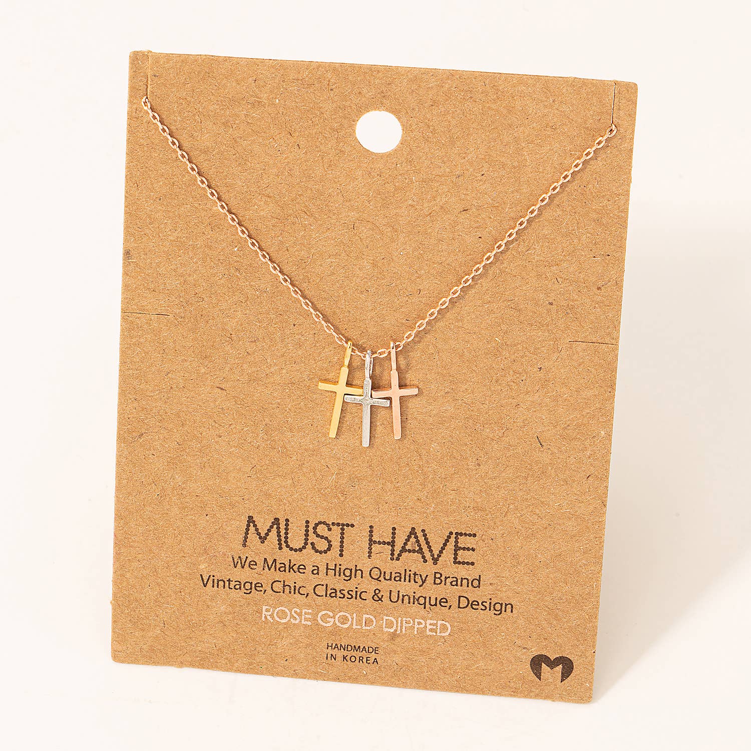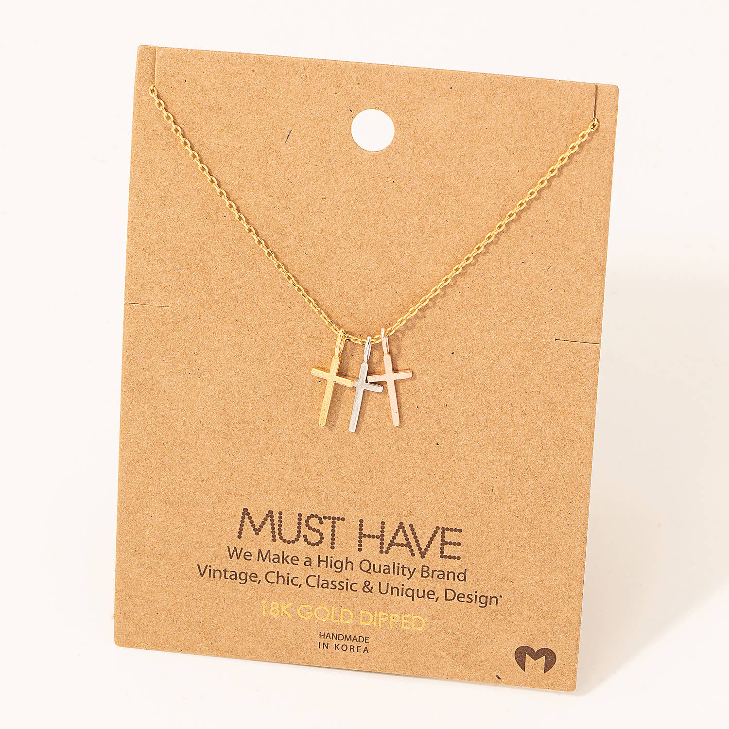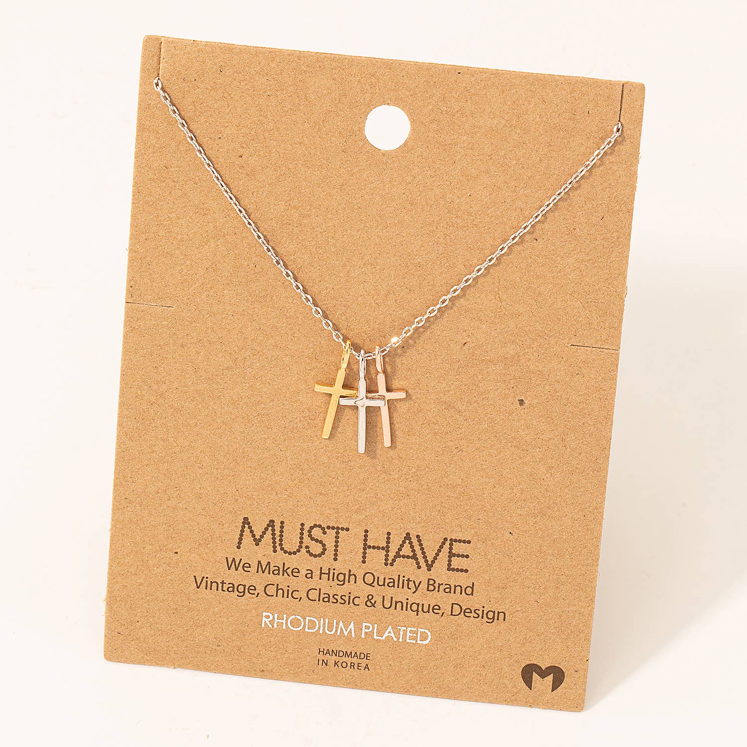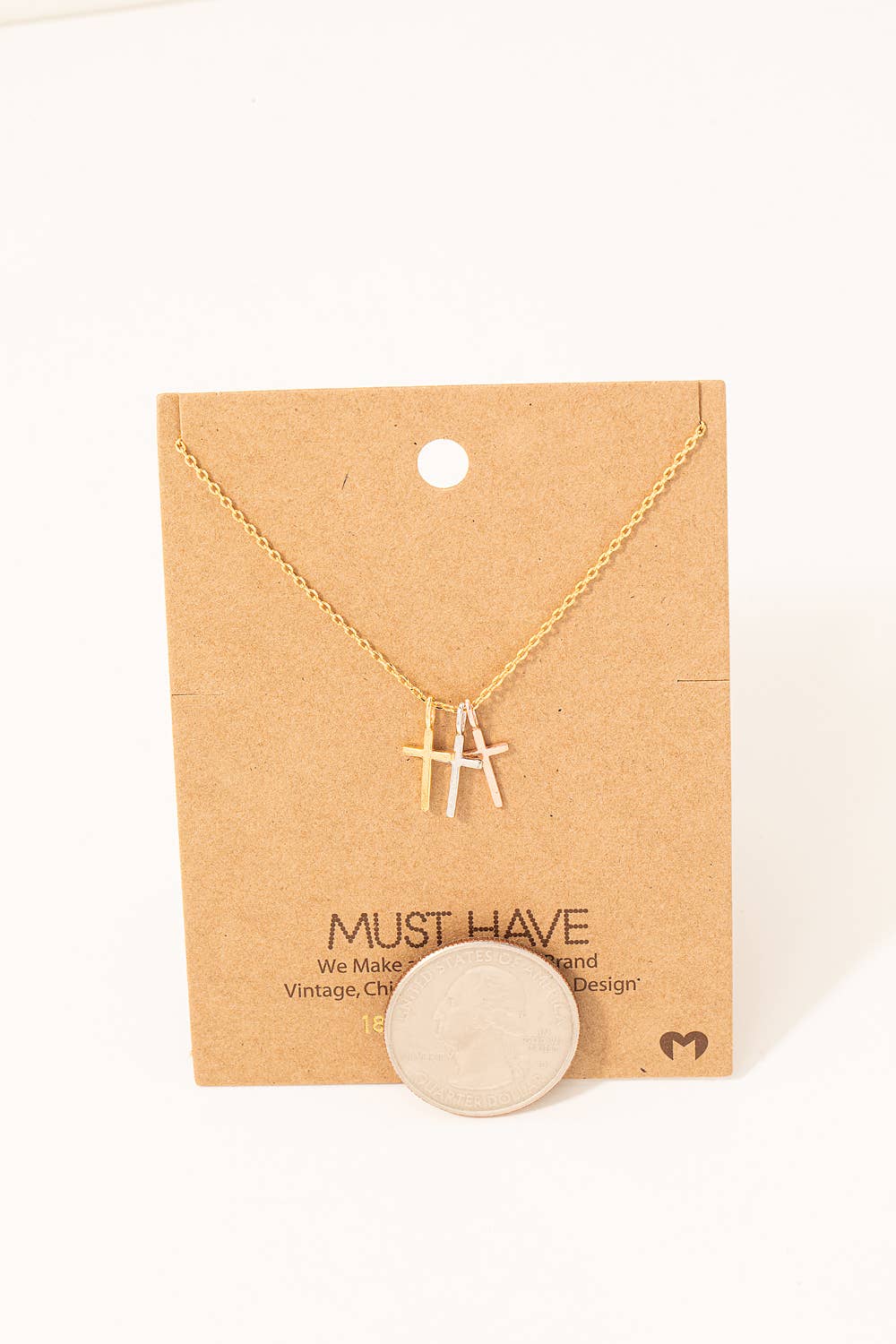 This trending necklace adds a modern triple cross pendant necklace style. Redefine your look effortlessly with this standout, on-trend piece.